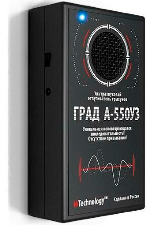 В отпугивателе "ГРАД А-550УЗ" использованы и улучшены успешные наработки предыдущей модели "ГРАД А-500" — алгоритм "звукового рисунка" значительно улучшен, эффективность отпугивания значительно возросла.